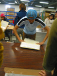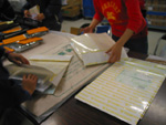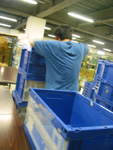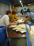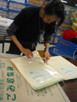 ほどなくして、 確実班も作業開始です。 【作業説明】 まずは西田店長が、 袋にいれる手帳の数、カバーの色などを 読み上げます。 これを品出し係がとってきます。 袋をうけとったなみこちゃんが、 数をかぞえて、 手帳とカバーをセットにします。 次に再度、あややが、 種類を読み上げながら、 アサノが確認しながら、 お手紙をおいていきます。 そして、それを、 袋詰めしていきます。 封をします。 で、ほぼ日見習いスタッフの、 「はせどん」が 箱につめる。 こちらは、佐川急便バーコード作業は、 佐川さんにお願いをしました。