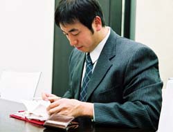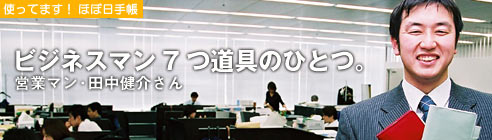 営業先でメモを取るときや、上役に呼ばれて 「ちょっとこれやっといて」なんて言われたことを メモするときに、 1日1ページ分、書き込みスペースがあるのは、 とにかく、便利ですよ。 何でも書けるから、朝、メモしておいて、 夕方、手帳を開いたときに、 「あっ、まずい、これ忘れてた、やらなきゃ」 なんてこともあったりして、すごく助かってます。 また、これだけ記入スペースがあると、 はじめてのアポイントで伺うような場所でも、 名前や住所、電話番号なども、 予定のすぐ隣に、書き込めるんですよ。 つまり、左の方に予定を書いて、 右方向に目をやると、それに関するメモがある、 という“横の流れ”が作れるんで、 予定や情報の管理が非常にしやすいです。