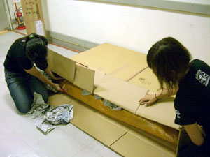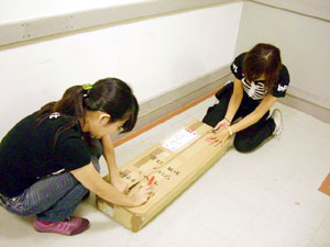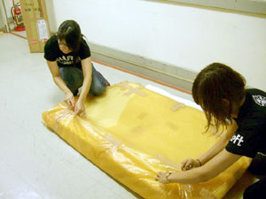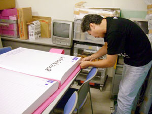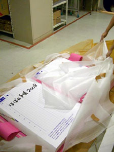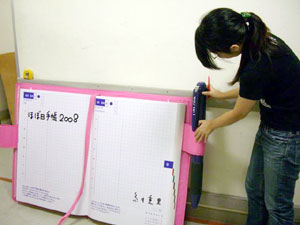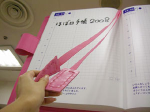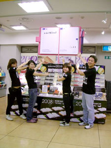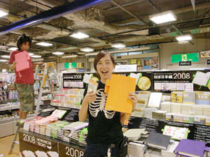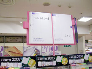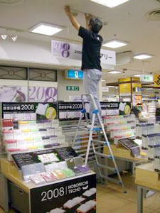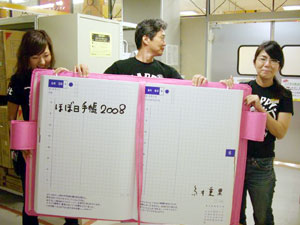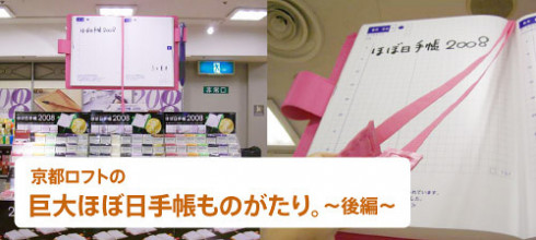 完成した見開き巨大ほぼ日手帳は、 責任を持って自分で吊りたい。 高さや角度など自分自身でやれば次の課題も見えてくる。 この企画に関わっていただいた皆様には 細井の必要以上(?)とも思われるかもしれない コダワリでブルンブルン振り回されて スタッフには迷惑をお掛けしてしまいました。 企画のキックオフを行った6月5日は、 未だ2008年版のカバー色や オプションも私たちは見えない状況から、 ほぼ日手帳の仕入れ計画、販売計画を シミュレーションすることと平行して煮詰めていったのです。 結果的な出来栄えは、非常にシンプルで 今までの右往左往は微塵も感じられませんが。 どうか皆様、京都ロフトへご来店の際には 【京都ロフトの看板娘】を一目見ていってやってください。 宜しくお願い致します。 (京都ロフト販売課 細井潤治)