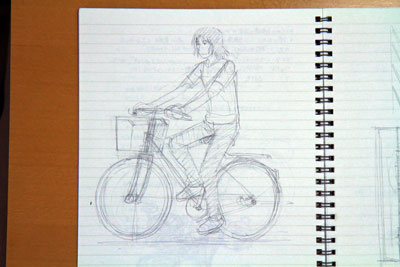 ▲あずま先生のノートに描かれた自転車に乗るとーちゃん。