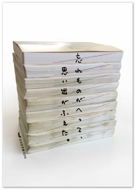 <秋山具義さんからのコメント> ぼくはこのコピーから、一年間だけじゃなくて、 何年もつかった「実感」のようなものを感じました。 このポスターの写真に使われているのは 実際にぼくがつかってきた「ほぼ日手帳」です。 ずっとつかっていると、 どうしても手帳の側面が汚れてくるんですね。 このつかっていた形跡が、 「思い出」につながると思いました。 また、こうやって手帳を積み重ねることで、 自分の思い出も地層のように 積み重なっていくことを表現しました。
