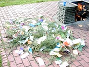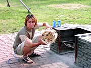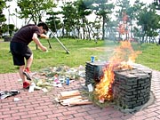 | <燃やしてきたぜ!> こんにちは。 単に誕生日が7月7日だということで ミスター七夕を気取るROCK西本です。 最初に断っておくと、 今回のお話は「燃やした」ってことだけです。 さて、7月7日に恵比寿で行われた、 ほぼ日七夕イベントへ多数のご来場、 ありがとうございました。 https://www.1101.com/store/HOBOT/010707.html 当日、会場では大勢の皆さまには 短冊に「願い事」を書いてもらいました。 10本用意した笹が願い事で一杯になったもんなぁ。 皆さんの思いが詰まったこの短冊。 そのまま燃えるゴミとして、 東京都のゴミ袋に入れて捨てるなんてことはせず、 みんなの願い事を叶えるためにも 短冊を燃やして供養することにしました。 (これって、供養って言うのかなぁ。) 短冊を燃やす為だけなのに、 キャンプ場に予約なんかいれちゃいまして、 供養スポットである若洲公園へ 発送隊の「う〜さん」と二人仲良く出かけました。 このキャンプ場に来るのは アウトドアダイニング部以来です。 あの時は寒かったから、 火を起こすのも楽しかったけど、 今回は炎天下だ。 真夏の平日、キャンプ場は閑散としていた。 ![]() 誰もいねえよ 海に一番近いところに陣取って 火をつける段取りを始めるう〜さん。 こういう時は彼は間違いなく率先して動く男だ。 そんな彼が書いた短冊には 「家が欲しい」とだけ書いてあった。 そうなのだ、彼は仮性ホームレスだったのだ。 1泊200円だし、 いっそ、このキャンプ場に住んだ方がいいのでは? と思わせる手際の良さで火を起こすう〜さん。 こんな時は決まって傍観者を決め込む俺。 そう、ミスター七夕は面倒くさがり屋さんなのだ。 <減点俺> 火が着いてからが本番だ。 ミスター七夕としての役割はそれからだ。 う〜さんに、ポカリスエットを与えて 少し気を良くしてもらうことにした。 <加点俺> 大体、こういうときの俺はむちゃくちゃ冴えている。 ![]() ポカリで買収されたう〜さん 新聞紙につけた火だけで、薪が燃え始めた。 梅雨なのに乾燥しているのだろうか? それともホントにう〜さんの腕が良いのか解らないが、 あっという間に準備が出来た。 ![]() 準備おっけーッス ようし、準備は出来た。 ここからが、ミスター七夕の出番だ。 ミスター七夕は基本的に「いいとこどり」が好きだ。 おおりゃぁぁあぁ! と笹を投げ込む俺。 燃える短冊!破裂する笹! 暑い!熱い!アツイ! ![]() ひるむ俺 この熱さに耐えろ!耐えてこそ、 ミスター七夕ぞ! という天の声を聞いたかどうかは解らぬが Tシャツを脱ぎ捨て、 一心不乱に笹を火に投げ込む我ら。 傍目には会計帳簿を証拠隠滅をする チンピラのように映っているんじゃないか?ってな どうでもいいことを考えること10分あまり。 全ての笹を燃やし切った。 <加点俺> ![]() そして燃えた…。 みなさんの願い事が叶いますように。 来年もやるかも(?) |