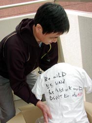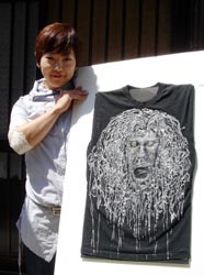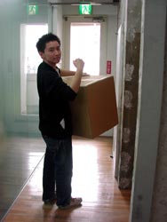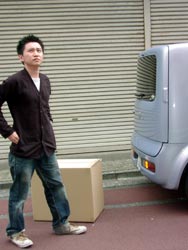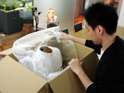 | リアル発送隊が行く! TARO-Tお届けしました。 芸術は爆発だ〜〜〜〜!!! みなさんはじめまして。 ほぼ日刊イトイ新聞の西田です。 「ほぼ日」ストアのメンバーのひとりとして、 ふだんは、みなさまからのご質問に メールでおこたえしたり 発送の準備をしたりしています。 ちなみに、ゴールデンウィークスペシャル企画 「ヘタうま」では西田画伯として大活躍しました。 ぼくの手長男、見ていただけました? いいい〜ん。 「ほぼ日」のグッズは、そのつど 販売のしくみや方法が個性的なのですが 「伊賀大介presents TARO-T岡本太郎TributeTシャツ展」 のTシャツは、なんたって、 抽選販売ののちに、実物が 前代未聞の全国行脚の旅をいたしました。 Tシャツをご購入いただいたオーナーのみなさまには、 たいへん長らくお待たせしました。 やっとTシャツがみなさんの手に戻ってゆきます。 ぼくたちも、Tシャツ達と共に歩んだ約1年間の旅に 思いを巡らしながらひとつずつ心を込めて 梱包をしてゆこうと、ゆこうと、ゆこうと、 思ったのですが、なんじゃこりゃ〜〜! 本当にTシャツか?と思うような、 色んな形をしている岡本太郎トリビュートTシャツ達、 さすがは岡本太郎を引き継ぐ方々が作るものだな〜。 「梱包を拒否する」とか、いわんばかりやわ。 でも、やってやろうじゃないの! 可愛い子ほど手がかかるっていうじゃないの!! いざ、ほぼ日ストアの力を発揮!! 梱包できぬものなんぞない! セッセッセッセッセッセッセッセッセッセッセ ![]() 田島貴男さんもなんのその。 セッセッセッセッセッセッセッセッセッセッセ ![]() 高橋ラムダさんもなんのその。 セッセッセッセッセッセッセッセッセッセッセ ほぼ日ヤング乗組員の西田と斉藤ヒーゲで挑めば 梱包できぬものなしっっっ! ![]() よし! これですべての梱包を終了した! と、思ったその時! ず〜〜〜〜〜〜〜〜ん 目の前にたちはだかったのは、、、 ![]() ず〜〜〜〜ん ![]() ずず〜〜〜〜〜ん 一青窈さんと片桐仁さんのTシャツです。 こりゃ無理だ〜。 なぜって? 一青窈さんの作品は、女の人が着ている形を 石膏でそのまま固めてあるのです! おっきいし形が崩れそうで 怖くて梱包できません。 そして、もうひとつのラーメンズ片桐仁さんの Tシャツに至っては・・・・・ 蝋で絵を描くなんて・・・・。 少しでも触ったらパリパリいって崩れちゃいそう。 顔が怖いし〜。 雰囲気も怖いですよ〜。 絶対梱包無理!発送無理! ほぼ日ストアのメンバーみんなで あ〜だこ〜だど〜だそ〜だと 途方にくれているときに、誰かが言ったのです。 「直接持ってっちゃえば」 そうだ! どうせなら直接持ってった方が面白いね! とゆーか、梱包できないし持っていくしかないね! ということで、このふたつのTシャツを ほぼ日乗組員であるぼくたちが直接 お届けに行くことにしたのです。 「リアル発送隊」に行ってきます! ===4月某日=== いや〜いい天気だなあ。雲ひとつない。 ![]() 手前にある車が リアル発送隊の専用車(西田カー・自前)です。 これが俗にいう「太郎晴れ」ってやつですね! 岡本太郎さんは凄い晴れ男で、行く所は いつも快晴だったのだそうです。 本日お届けするのは、 片桐仁さんのTシャツのオーナーであります、 東京近郊に在住のNさんのお宅です。 休日の朝はやくからお邪魔することを こころよくご了解くださったSさん。 お会いするのにとてもドキドキしました。 万が一のことがあっても大丈夫なように、 Tシャツはばっちり補強しています。 ![]() 少しの衝撃でも蝋がはがれ落ちるので、こんなふうに、 プラスティックの板で挟んで固定しています。 この梱包方法をあみ出すのに なんと2時間を費やしました。 「最初になんて言おうかな〜、ああドキドキ」 などと考えながら、Sさんのお家を探していると、 おお、いらっしゃいました! お家の前でお待ちいただいていました! おはようございます〜。 お互いに緊張しながら世間話をちらほら。 さっそくTシャツをお渡しします。 ![]() お待たせいたしました! すごく喜んでくださったNさんに ぼくも嬉しくなりました。 しかもNさんはなんと、 この日が誕生日だったとのこと。 うれしくて、ハッピーバースデーの歌を 玄関先で声をそろえて唄ってしまいました。 ご近所迷惑にならなかったかなあ。 ![]() 「お部屋に飾りますー!」 それにしてもTシャツの顔がこえ〜〜〜。 このTシャツ、部屋に飾っておいたら ご家族のみなさんがビックリしてしまいそうですよね。 魔除けにもなりそう。 ===さらに後日の4月某日=== さてさて、お次は一青窈さんのTシャツです。 もちろん本日も快晴です!! ![]() さ、これをどうやって運びましょうか。 誰かが着てるようですけれども 中は空洞なんですよこれ!! すごいな〜どうやってつくったんだろうな〜。 なんてことを考えながら梱包をしていきます。 ![]() しんちょ〜うにしんちょうに 段ボールに入れていきます。 胸についている羽がとれちゃわないように、 そ〜っとそ〜〜〜〜っといれます