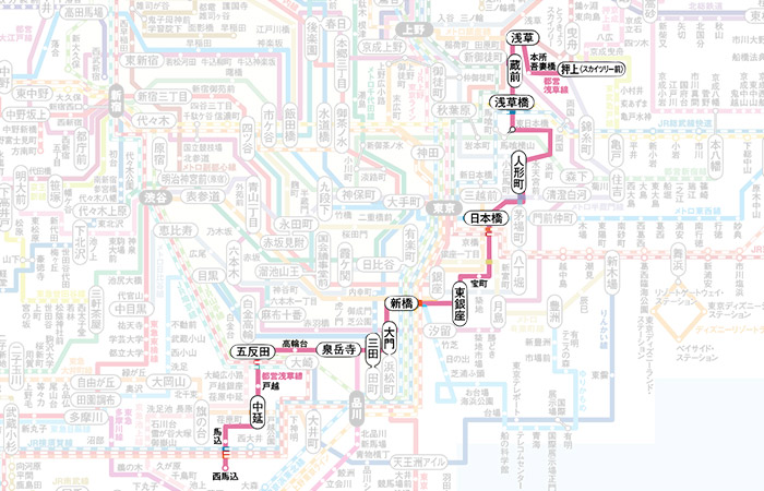 浅草線は主に、東京23区の北と南を結ぶ路線です。