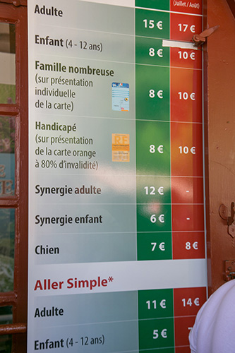 今回のバカンスで訪れた フランスとスペインの国境にある 標高905mの山に登る登山鉄道の チケット売り場を見ると、 「おとな料金」「こども料金」 そして「イヌ料金」という表示が (Chienという単語がイヌです)。