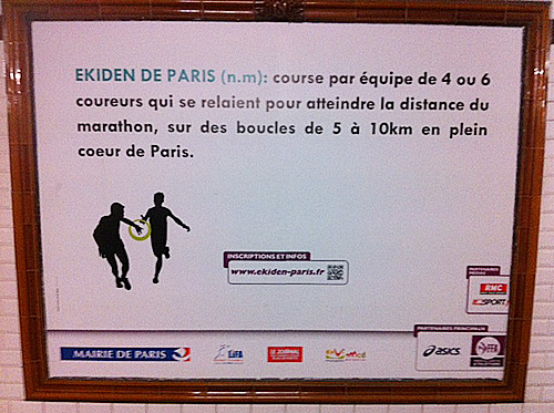 しかしまだまだ知名度が低い、 「駅伝」というスポーツ。 駅伝のスタイルを説明する広告つきで ついにパリでも第1回の大会開催となりましたが、 さてさて、フランスで「駅伝」は 人気になっていくのでしょうか?!