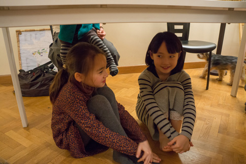 いちばん年下の子供がテーブルの下へ。 切り分けた人:「これは誰にする?!」 というように繰り返し、