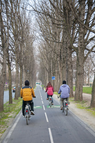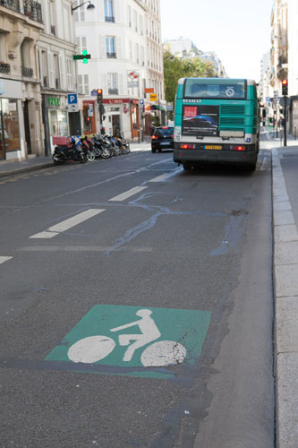 フランスでは自転車は 自動車と同じ扱いなので、 自転車専用レーンがあるとこ以外は 基本的に車道を走らなくちゃいけないよ。