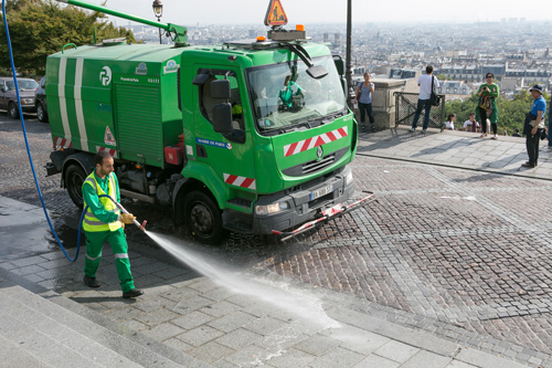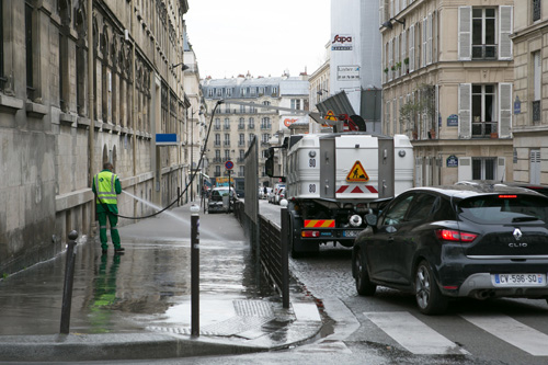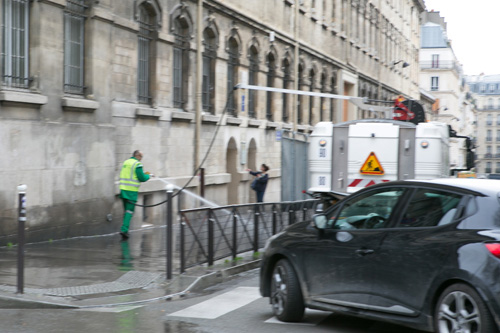 パリの名物、 道路にこびりついたイヌの落とし物にも、 ポイ捨てされたタバコにも、他のゴミにも、 すべてものすごい勢いの水を 噴射していくわけですが。。。