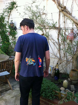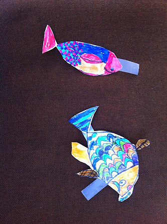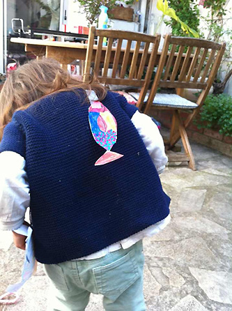 私の友人も、幼稚園にお迎えに行った時、 いつの間にかこども達に魚を貼られていて、 夜、旦那様に指摘されるまで 全く気づいていなかったそうで。。。 スーパーとか行ったのに 恥ずかし〜!!! と、ショックを受けておりました(笑)。