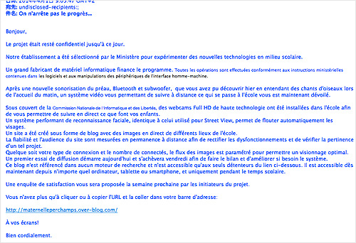 「今日まで発表出来なかったプロジェクトが 開始しました。最新技術を試みるために、 我が校は文部省に選ばれました! 授業の風景をWEBカメラで常時見ることが 可能になります。 携帯、パソコン、タブレット何ででも アクセス可能! 下記のリンクにアクセスして下さい。」