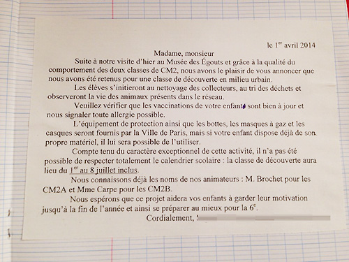 「昨日の下水道博物館見学の際に 子ども達の態度が大変良かったため、 7月1日〜8日に下水道掃除、 ゴミの仕分けなどを目的とした旅行に 行くことになりました。 つきましては予防接種の確認をお願いします。 ガスマスクをはじめとする装備、服装は 全てパリ市で準備しますが、 もしすでにお持ちでしたらそれをお使いください。 旅行のアシスタントは A組がムッシューパイク(魚の名前)、 B組がマダム鯉と決定しております。 この旅行を楽しみに、 学年末までがんばってほしいものです。 A組担任、B組担任」