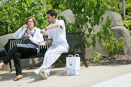 遊園地で制服を着た従業員の人が、 園内のベンチに座って 楽しそうにランチタイム。 ってことだからね。