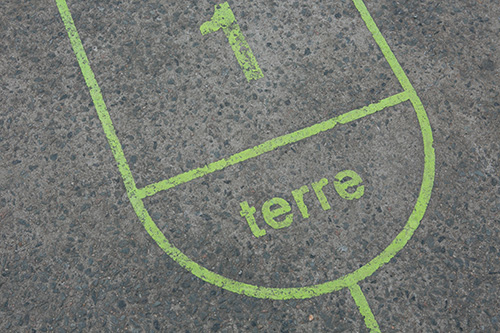そして戻ってくるときに、石を置いた数字の直前の数 (つまりこの場合は「1」に置いたから 直前の数は「2」) のところで止まり、石を拾い、 また「1」を飛び越えてスタート地点の 「terre」(地)に戻ったら次の人の番!