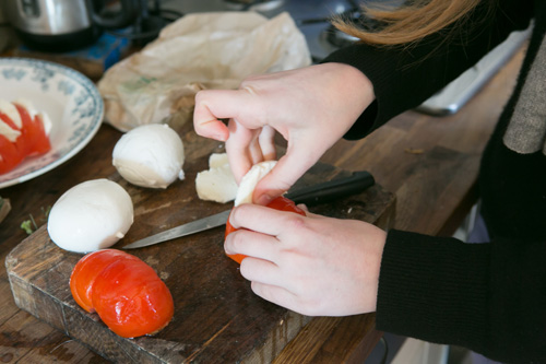 そうそう。 日本のお台所風景と言ったら、 玉ねぎも人参も、まな板の上で トントントントントン! と、軽快な包丁さばきが定番ですが。