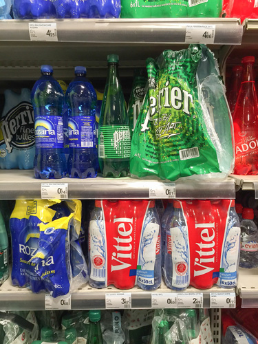 日本でもおなじみのブランドから 見たこともないブランドまで ものすご〜い数の銘柄が並ぶ スーパーの水コーナー。