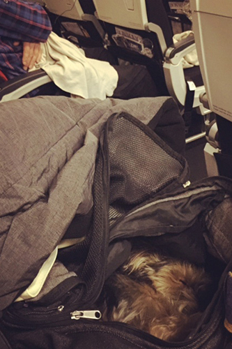 唯一機内食が運ばれてくると、ゴソゴソ。 「ボクにもそれをくれ〜!!!」 と、カバンをガリガリするのがお決まりですが、 たいてい乗客は誰も イヌがいることには気づきません。