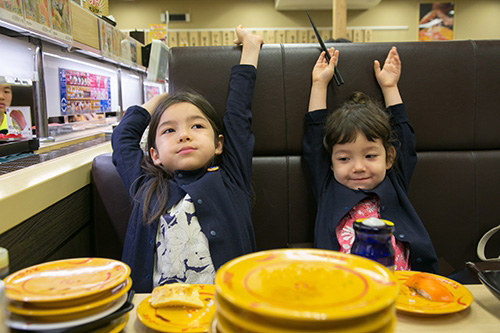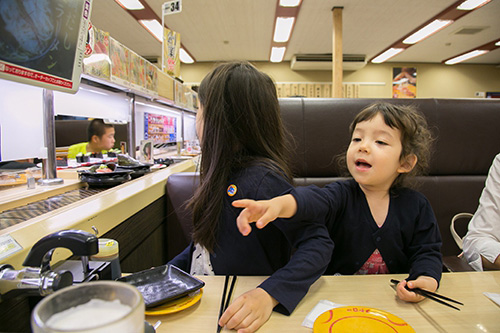 というわけで、その一家のちびっ子たち、 フランスと日本のハーフちゃん Linちゃん(7才)とLilyちゃん(3才)と 過ごすことも多かった今回の滞在。 日本でしか思いっきり食べられない、 回転寿司にもみんなで一緒に行きました♪