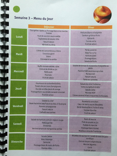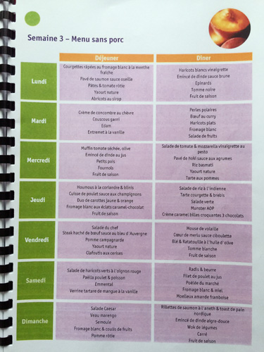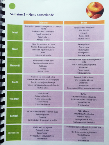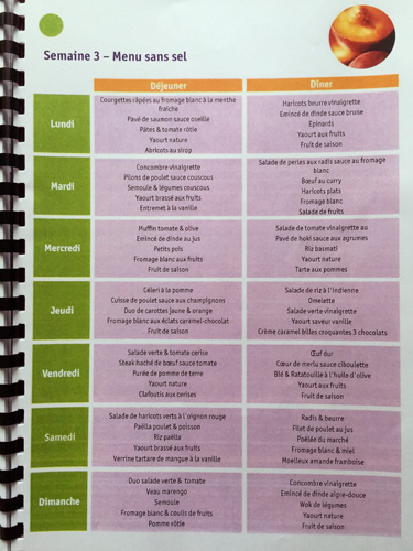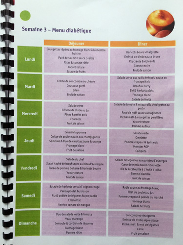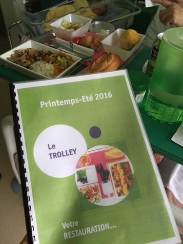 毎日の献立が書かれているメニュー。 通常メニューに加えて、 「糖尿病用」「塩なし」 「肉なし(ベジタリアン食)」が 選べるようになっているのは納得として、 さらに「豚肉なし」というメニューが 当たり前のようにあるのが フランスならでは。