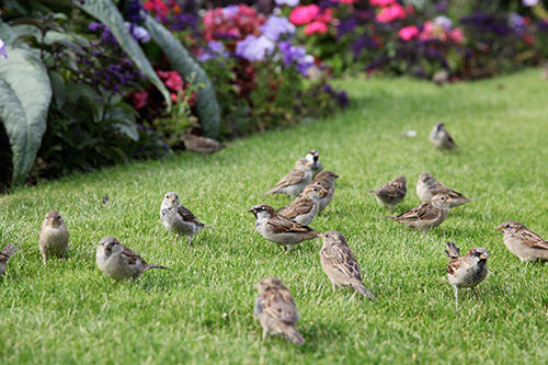 公園を歩いていたら ハトと同じように近い距離で スズメたちが遊んでます。