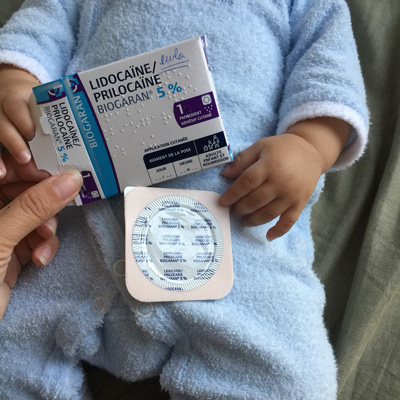 「麻酔パッチ」。 注射の1時間くらいまえに 湿布のようなパッチを注射をする部分に (赤ちゃんのワクチンは太ももを指示されます) 貼っておくというもの。
