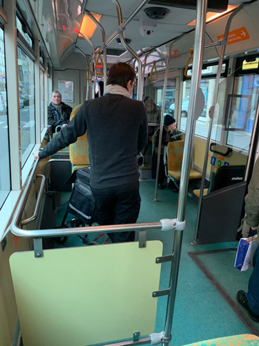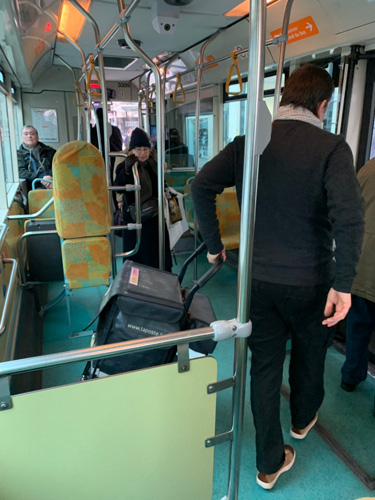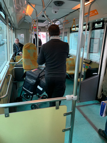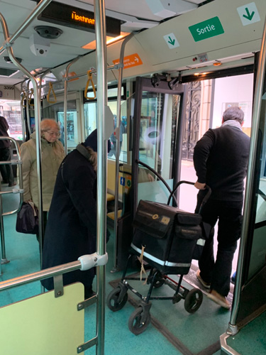 パリのバスは、車両のちょうど中程、 後ろのドアのあたりが座席のない、 「ベビーカー」や「車椅子」などを 置けるスペースになっていますが、 郵便配達の人たちも大きなカートを このスペースに置いて。