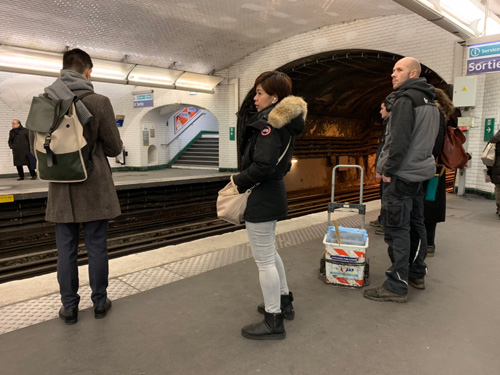 ▲メトロのホームで待つのはホームの広告ポスターはりのムッシュー。