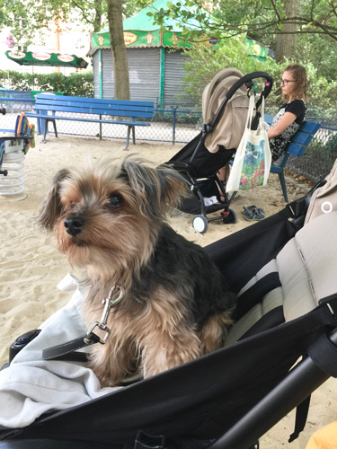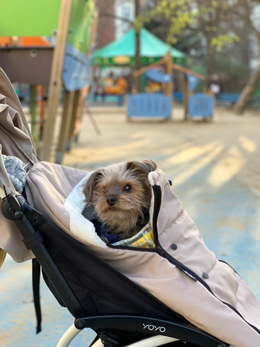 犬たちは、公園を通るときは みんなちゃんと抱っこされているよ。 ボクもプチモンスターの お供をするときは、カバンの中に入ったり ベビーカーの上に座ったりして、 大人しく待っているしね。 公園の中では、歩くのガマンガマン。 (パリには野良猫はいないから 猫問題はもともとほとんどないんだ。)