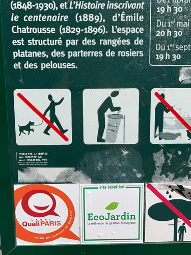 そして、街を歩けば犬の落し物に当たり、 建物の壁にも道路にも、 ありとあらゆるところに 犬の(時には人間たちの) オシッコのシミが付いている、 清潔という面では疑問点が多いパリですが、 公園の中だけは きちんとルールが守られている場合が 多いのです。