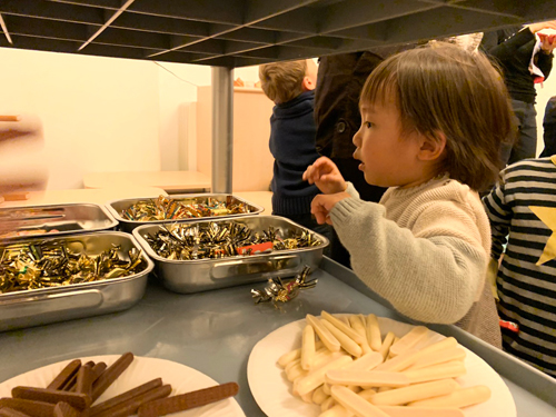 親たちが自由に持ち寄って差し入れする お菓子のほとんどが、チョコレート菓子。 子供の目線に、山盛りになった お菓子たちが運ばれてきて、 みんなショコラ食べ放題!! 子供たち全員大興奮!