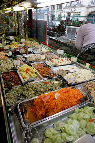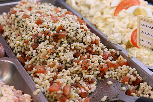 ▲量り売りの惣菜を売るようなお店でも必ずある定番のサラダ。 このお店にも「ブルグル」タイプ(手前のにんじんの上)と 「クスクス」タイプ(右上奥)両方おいてあります。