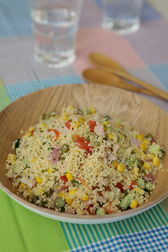 ▲フランスで「タブレ」といえば最もポピュラーな細かいクスクスを使ったタイプの サラダがこれ。スーパーで売っているのもほとんどこのタイプ。 きゅうり、とうもろこし、トマト、パセリ、ピクルスなどが入ってます。