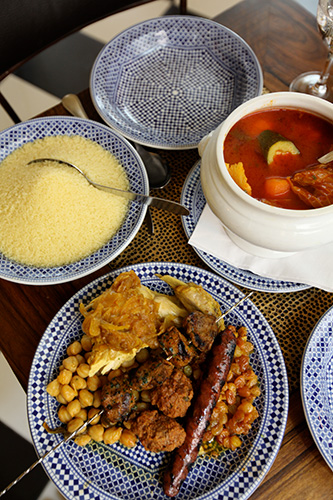 ▲モロッコ料理の「クスクス」に登場するクスクス(左上)。 黄色い細かい粒状のクスクスに野菜たっぷりのスープをかけて お肉や豆などをのせていただきます。