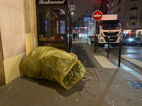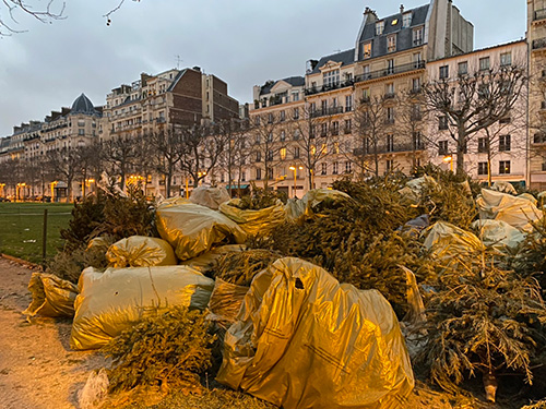 ▲パリのあちこちに設置される「もみの木置き場」。 区ごとに何箇所も場所が決められ発表されます。