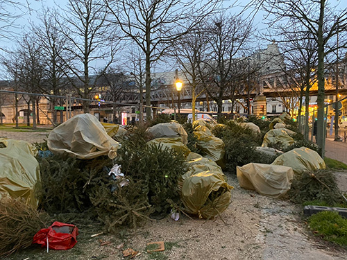 このリサイクル置き場以外には、 スーパーなどで売っている 専用の巨大ゴミ袋を買って、 捨てることができます。 クリスマスが終わり、1月中は 巨大ゴミ袋に入れられたもみの木が 街のあちこちに転がっています。 規則を守らず袋に入れないまま 転がされているものも 多数見かけますが‥‥。