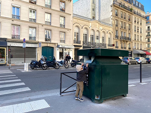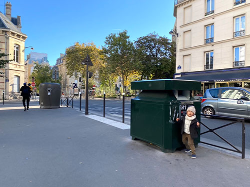 パリの街中を歩いていると、 こんな大きな箱を見つけるよ。 この写真、写真奥に写っている大きな箱が 以前もこのコラムで紹介した瓶専用のゴミ箱。