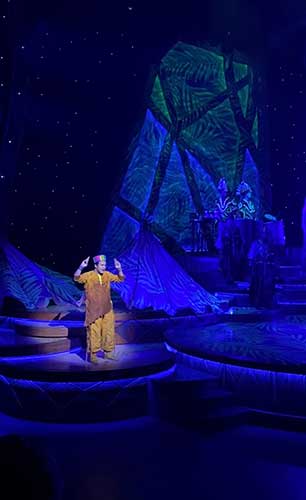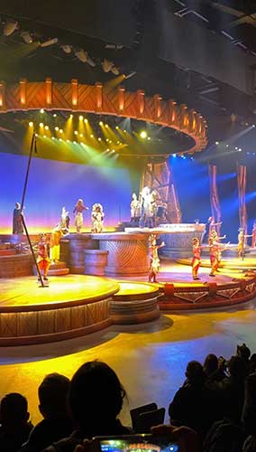 ▲ライオンキングのショー。 左から3番目の手で円を作っているみたいな仕草をしている人が 手話をする俳優さん。他の演者とは違う動きをしています。