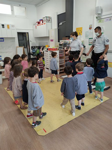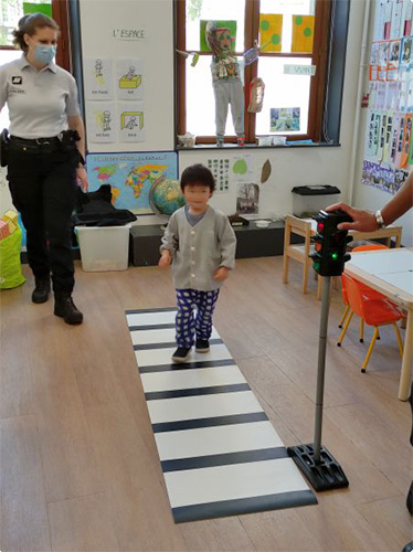 ▲信号を守る人が少ないフランスでも、 ちゃんと幼稚園には警察官が来てマナーを教えてくれていました。