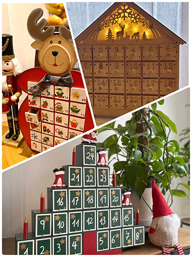 ▲旅の思い出などどこかで買った木製のアドベントカレンダーを ずっと大切に使う人も多い。 引き出しに自分でお菓子やプレゼントを入れて。 子供が小さい時に買ったのをずっと大切にして思い出にも♪
