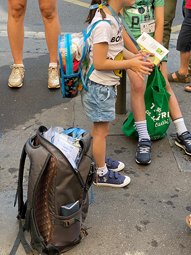▲例えばこの子の透明リュックごしに見えるお弁当。全部ジップロックに入っている。 オレンジに見えるのはメロン。カットメロンがジップロックに入っています。 わたしたちからみるとなんてワイルドな!と(笑)。
