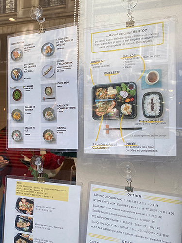 ▲今ではフランスでも日本のお弁当屋さん大人気でどんどん店も増えてます。 中身の説明を書いたものを貼っているお店なども多い。