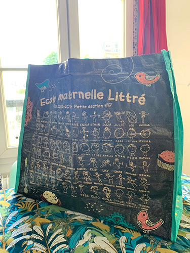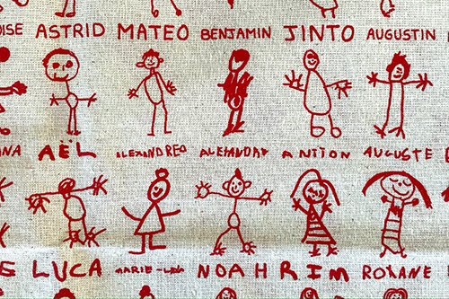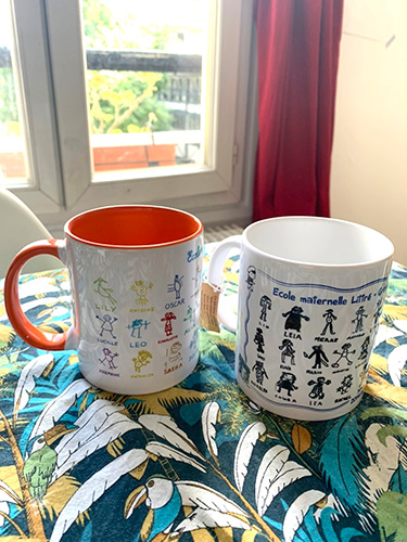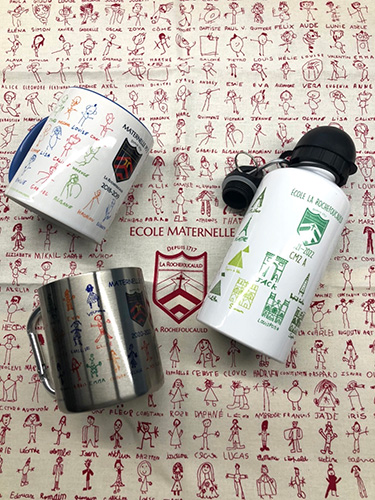 ▲子どもたちの描いた絵で作る記念品グッズ。 毎年これを作る学校が多いフランスの学校「あるある行事」のひとつです。