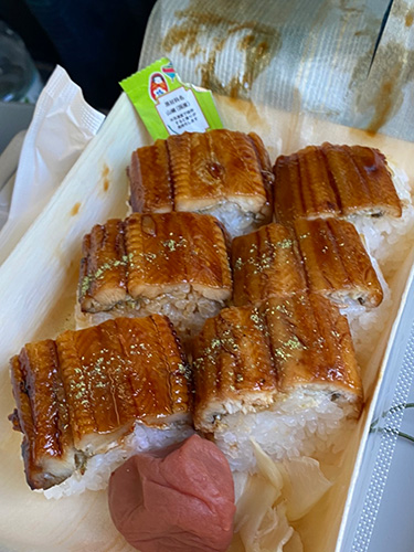▲これは電車の中でいただく駅弁に選んだアナゴ寿司。