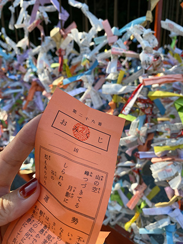 ▲フランスから帰ってきた日仏ハーフちゃんと一緒におみくじ。 なんで結ぶのかとか、色々な種類の「吉」がつく順列とか、 聞かれるとちゃんと答えられないことがいっぱい…。