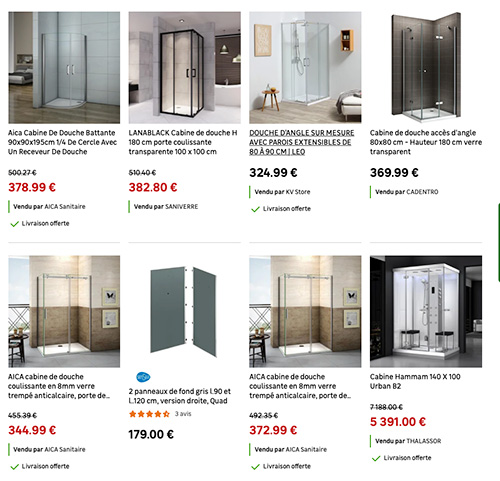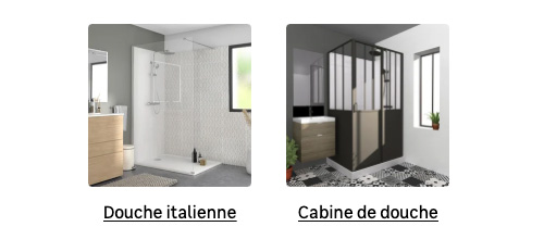 ▲フランスのDIY専門ショップの一つ「Leroy Merlin」(ルロワ・メルラン)のサイトから。 シャワーのページを見てみると、「イタリアン・シャワー」(左)か 「箱(ボックス)型シャワー室」(右)のカテゴリーに分かれてます。