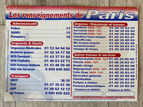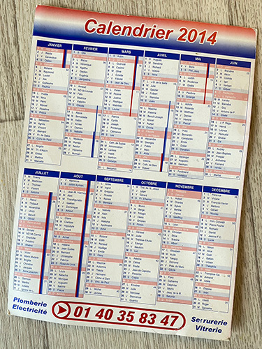 ▲上の2つは郵便受けによく入っている内装工事屋などの広告を兼ねた紙。 年間のカレンダーと警察・消防・交通機関・緊急の場合の連絡先・工事関係の連絡先など 便利な番号が記載されているので冷蔵庫に貼ったり。 カレンダーの後半部分にバカンスの記載がないのは、 おそらくこのカレンダーを印刷した時点で翌年度のバカンス期間が 発表されていなかったから。