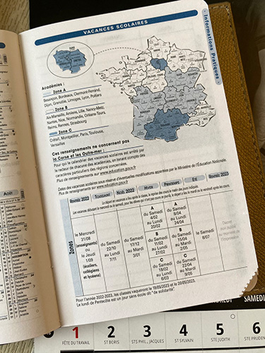 ▲こちらは日本でもお馴染みスケジュール帳「クオヴァディス」のバカンス記載ページ。 フランスで暮らす上で年間の「学校バカンス」の日程把握はとても重要。