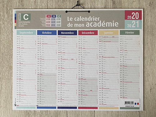 ▲文房具屋などで売られているかなりしっかりした厚紙の年間カレンダーボード。 左上に「C」とあるように、バカンス期間がずれる全国のAからCのゾーンごとの カレンダーが売られ、ゾーンごとのバカンスが記載されたカレンダーボード。 パリは「C」ゾーンなので我が家はいつも「C」。