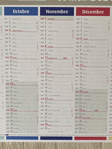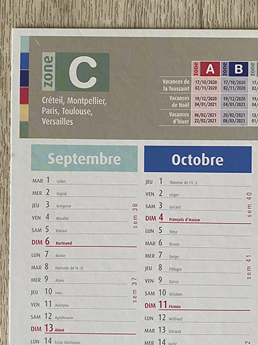 年末になると街頭で消防士さんが手売りする 「ポンピエカレンダー」にも、 (詳しくは過去のコラムをご覧ください。) 郵便受けにたまに入っている 工事屋さんの広告を兼ねたカレンダーにも、 フランスで販売されている手帳にも。 大体、年間の学校バカンススケジュールの 表記があります。 (逆にカレンダーやスケジュール帳を選ぶ時、 バカンスの表記があるかないかを チェックしたりするほど重要な項目)
