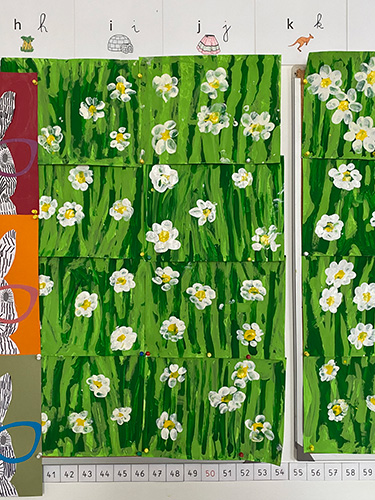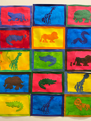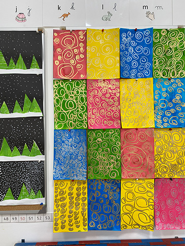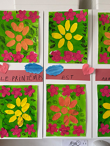 ▲フランスの学校の教室や廊下に貼ってある作品たち。 絵の具、ペン、色鉛筆で作業されたものばかりで、クレヨンを使ったものはなし。
